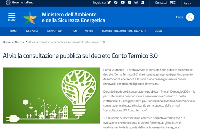 - Il Ministero dell’Ambiente e della Sicurezza Energetica ha annunciato l’apertura della consultazione pubblica per il Conto termico 3.0, fino al 10 maggio 2024.