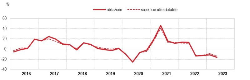 Nel secondo trimestre 2023, per quanto riguarda il comparto residenziale, l’istituto di statistica ha stimato un calo congiunturale del 5,2%, che coinvolge sia il numero delle abitazioni che la quantità della superficie utile abitabile. Ma vediamo nel dettaglio cosa sta accadendo nel comparto.