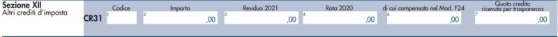 Nel Rigo CR31, devi indicare i crediti d’imposta diversi da quelli menzionati nelle sezioni precedenti. Se si desidera indicare più di un credito di imposta tra quelli elencati di seguito, sarà necessario utilizzare più moduli.
