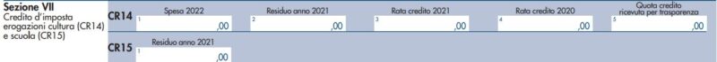 Compila il Rigo CR14 indicando l’ammontare delle erogazioni liberali effettuate nel corso del 2022 a sostegno della cultura o della scuola, come qui di seguito.