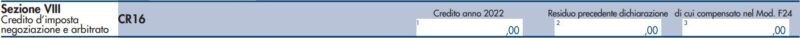 Se hai diritto al credito d’imposta per compensi corrisposti agli avvocati abilitati nei procedimenti di negoziazione assistita o agli arbitri in caso di conclusione dell’arbitrato, compila il Rigo CR16 riportando l’importo del credito d’imposta comunicato dal Ministero della Giustizia e l’importo del credito residuo dalla dichiarazione dei redditi dell’anno precedente, come qui di seguito.