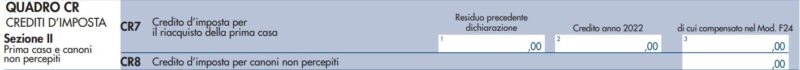 - Rigo CR7: se hai maturato un credito d’imposta a seguito del riacquisto della prima casa, compila questo rigo indicando l’importo del credito d’imposta relativo;